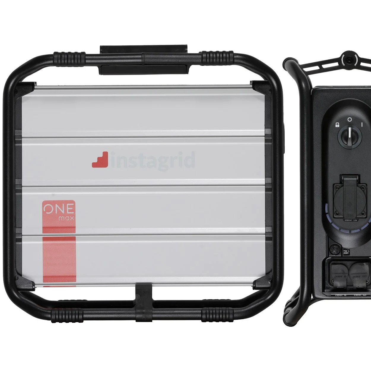 Our go-tobattery inverter. the Instagrid, with 230v output for running kit on set including lights and laptops.