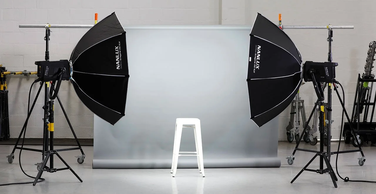 Dual Nanlux Evoke 2400B LEDs with 150cm Octagonal Softboxes for high-output, shadow-free e-commerce lighting.