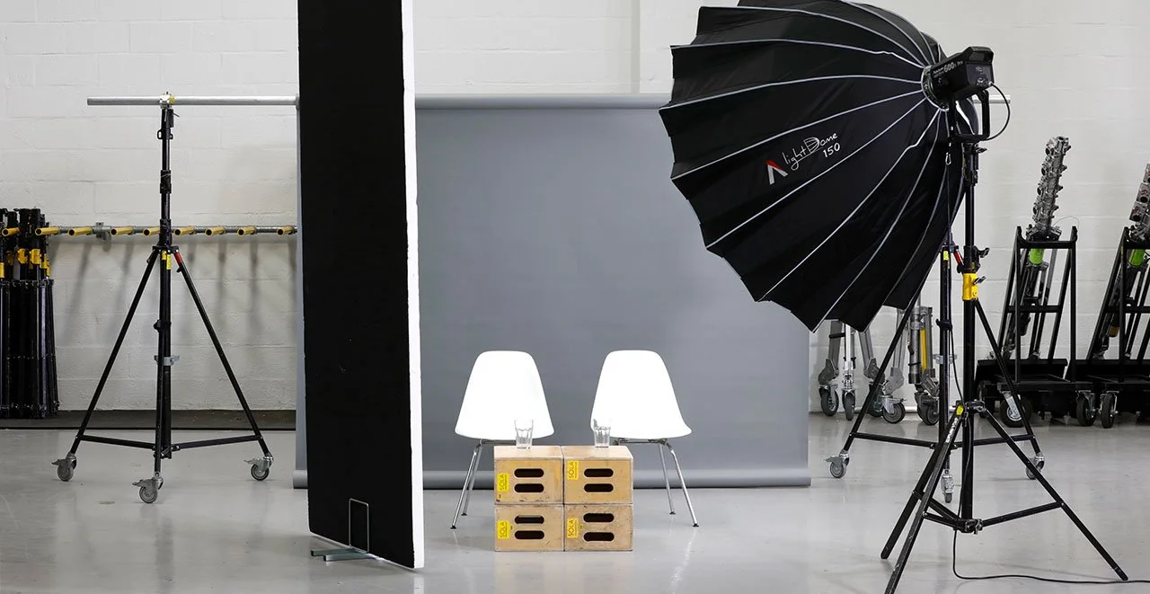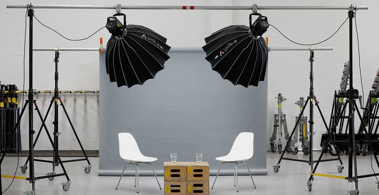 This setup uses a large Aputure Dome 150 for flattering, wrap-around light. The black poly keeps shadows deep and defined, and the light is positioned close to the subjects to create separation from the background. Use small RGB LED lights like the Aputure MC Pro panels, or Astera Helios tubes to add accents and colour for branded content.