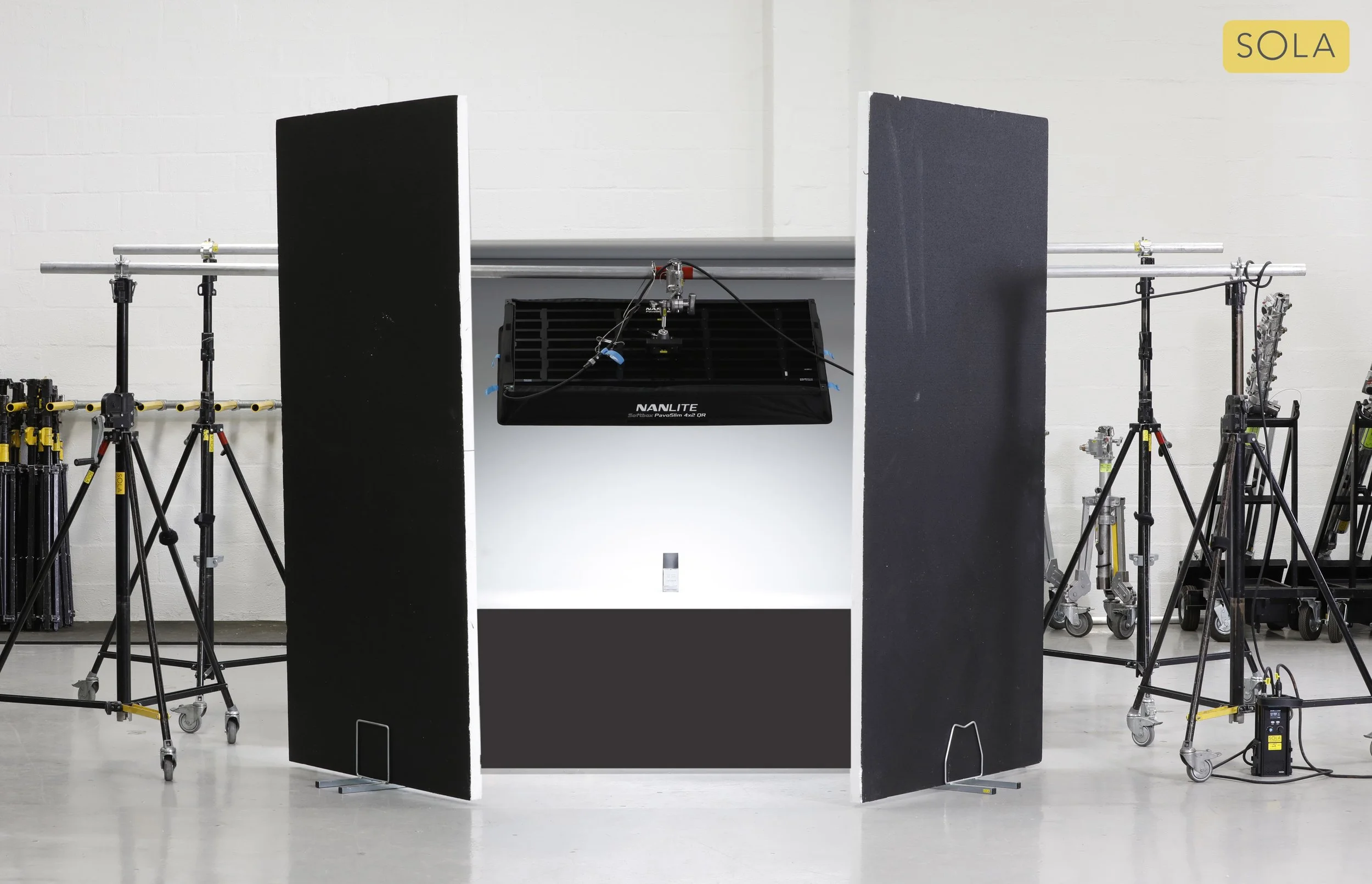 A large, soft source delivers clean, even coverage across both product and background — avoiding the complications of lighting them separately. Positioned directly above, it creates a single, controlled highlight on the product and a natural gradient on the Colourama.